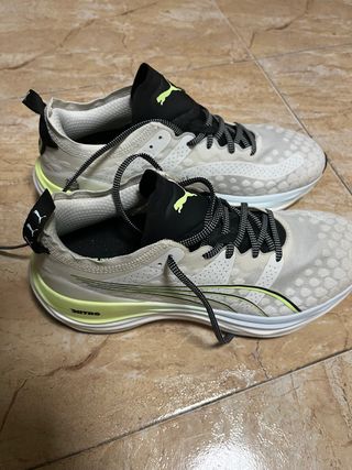 Zapatillas deportivas Puma Forever Run Nitro con un diseño moderno y llamativo. - Combinación de colores blanco y amarillo. - Detalle de líneas deportivas en verde lima. - Suela con tecnología NITRO.