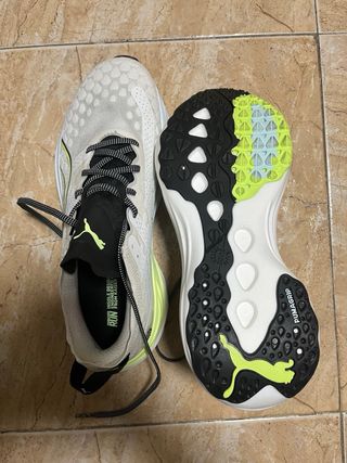 Zapatillas deportivas Puma Nitro en tonos beige y verde. Diseño moderno y ligero. - Sin caja. - Detalle de logo Puma en la lengüeta. - Suela con tecnología Nitro. - Cordones negros con detalles blancos.