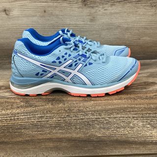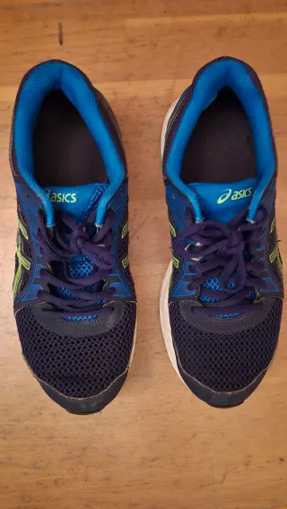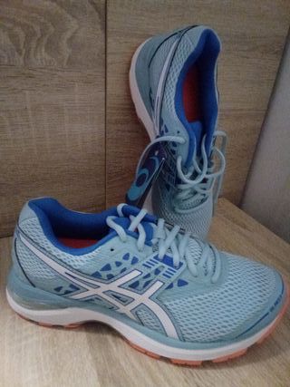 Zapatillas deportivas Asics para mujer en tonos azules y blancos. Diseñadas para ofrecer comodidad y estilo. Talla 39 pero calza pequeña es para una talla 38. - Parte superior de malla transpirable. - Detalle de franjas laterales Asics en blanco. - Suela de goma con amortiguación. - Cierre de cordones.