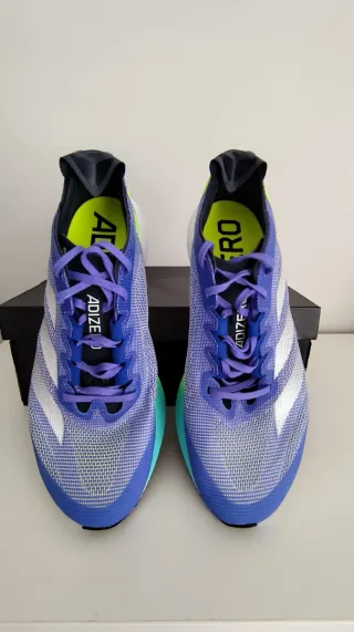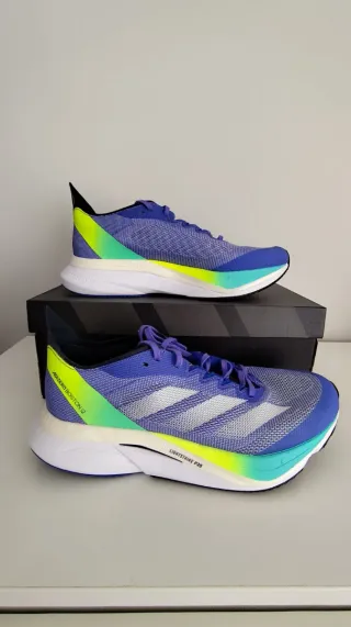 Zapatillas de running Adidas Adizero Boston 12. - Diseño en tonos azules y morados. - Detalles en verde lima y amarillo neón. - Suela blanca con detalles de color. - Zapatillas con placa. Un uso de 5 km, soy plantillero y no me he adaptado.