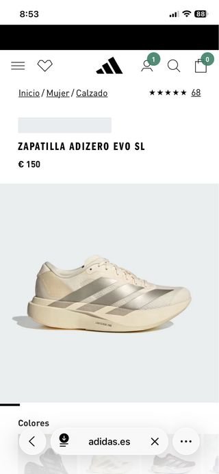 Zapatilla Adidas Adizero Evo SL en color crema, usada una vez. - Diseño ligero y transpirable. - Detalles de las tres rayas icónicas de Adidas. - Suela con tecnología Lightstrike Pro.