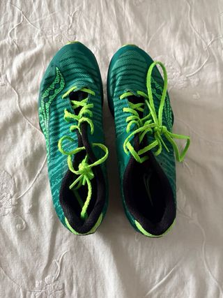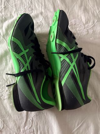 Zapatillas de atletismo Asics con un diseño llamativo. - Suela con tacos para un agarre óptimo. - Combinación de colores verde y negro. - Cierre con cordones.