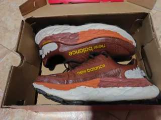 Zapatillas de trail New Balance More v3 en tonos marrones y naranjas. Diseñadas para ofrecer comodidad y rendimiento en terrenos irregulares. - Parte superior de malla transpirable. - Entresuela con amortiguación Fresh Foam. - Suela de goma para mayor tracción.