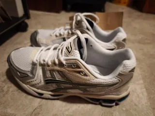 Zapatillas deportivas Asics Kayano 14 en tonos plata y blanco. Diseño moderno y cómodo. - Parte superior de malla transpirable. - Detalles sintéticos para mayor sujeción. - Suela de goma para tracción.