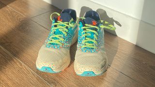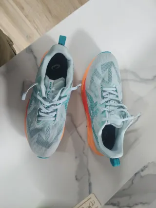 Zapatillas de running Asics Novablast 5. - 2 veces uso para ir al gim. -están en perfecto estado como se puede ver - no conservo la caja - Diseño moderno con detalles en verde azulado. - Suela con degradado de naranja a rojo vibrante.