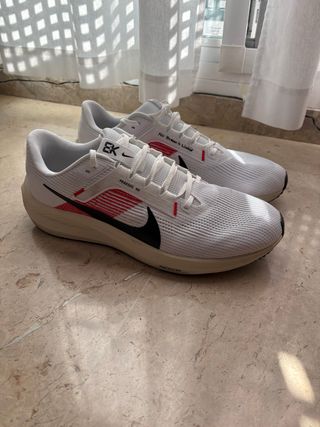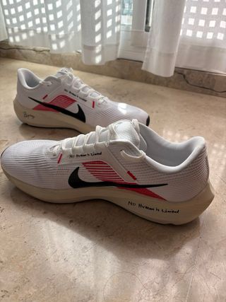 Zapatillas Nike Pegasus edición especial Kipchoge. - Perfecto estado. - Diseño en blanco con detalles en rojo y negro. - Logo EK en la lengüeta. - Inscripción No Human is Limited en los cordones.
