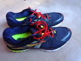 Zapatillas deportivas Brooks en color azul con detalles en rojo. Perfectas para correr o para el día a día. - Cierre con cordones. - Suela blanca y roja. - Interior con forro amarillo. -Están bien lavadas
