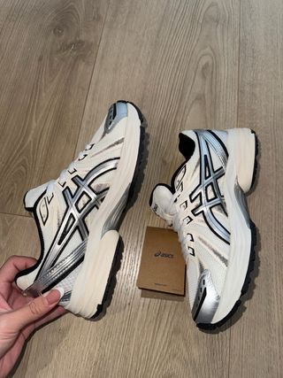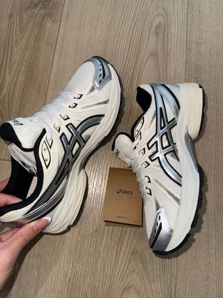 Zapatillas deportivas ASICS GEL-NYC en tonos grises y crema. Perfectas para el día a día. Me vienen un poco pequeñas, me las he puesto únicamente dos veces, se puede ver que la suela está sucia pero en perfectas condiciones. Pensaba que lo poco pequeñas que me vienen no iba a importar pero me resulta incómodo llevarlas. - Diseño moderno y cómodo. - Combinación de materiales textiles y sintéticos.