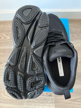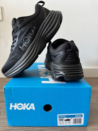 Zapatillas Hoka Bondi 8 en color negro. Diseñadas para ofrecer comodidad y amortiguación. - Parte superior de malla transpirable. - Entresuela de espuma CMEVA. - Suela de goma duradera. - Cierre de cordones. Talla 44eu
