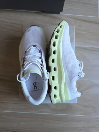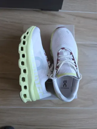 Zapatillas deportivas On Cloudmonster en color blanco y amarillo. - Diseño moderno y llamativo. - Suela con tecnología CloudTec. - Cierre de cordones. -2 veces puestas, me apreta un poco de la orma.
