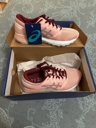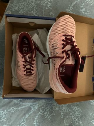 Zapatillas deportivas ASICS para mujer, ideales para running. Presentan un diseño moderno y cómodo. - Color rosa con detalles en rojo. - Cierre de cordones. - Suela blanca.
