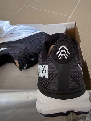 Zapatillas de running Hoka Clifton 9 para mujer. - Diseño en color azul con detalles en rosa. - Parte superior de malla transpirable. - Suela de espuma para amortiguación. - Cierre de cordones. - Están prácticamente nuevas. Se utilizaron dos meses y desde entonces han estado guardadas. La suela se ve sucia del suelo pero la suela exterior (los dibujos y relieves) están en perfecto estado.