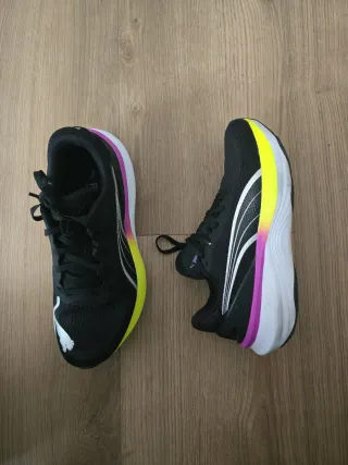 Zapatillas deportivas Puma para running con un diseño moderno y llamativo. - Parte superior de malla transpirable. - Detalle de franjas laterales en contraste. - Suela con amortiguación para mayor comodidad.