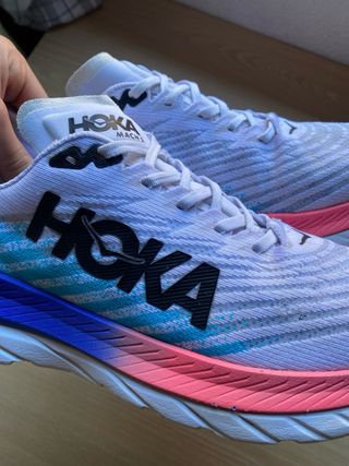 Zapatillas Hoka Mach 5 en colores blanco, azul y rosa. Diseñadas para correr. - Parte superior de malla transpirable. - Mediasuela PROFLY+ para amortiguación y respuesta. - Suela de goma para mayor durabilidad.