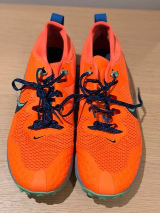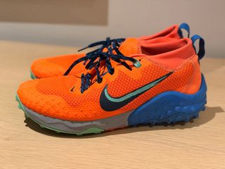 Zapatillas Nike Wildhorse 7 para correr, con un diseño vibrante en naranja y detalles en azul. - Parte superior de malla transpirable. - Suela exterior con tacos para mayor tracción. - Cierre de cordones para un ajuste seguro.