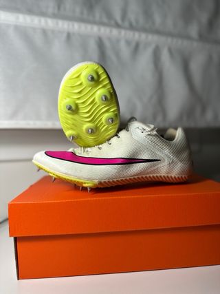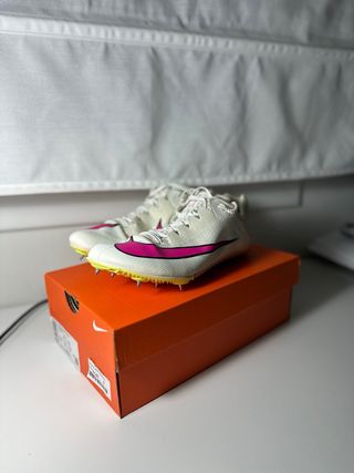 Zapatillas de atletismo Nike para mujer en color blanco con detalles en rosa. - Diseño ligero y aerodinámico. - Suela con clavos para máximo agarre. - Ideales para competición.