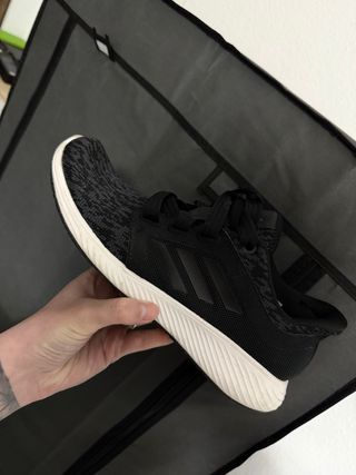 Zapatillas deportivas Adidas en color negro y gris. - Diseño moderno y cómodo. - Suela blanca con textura.