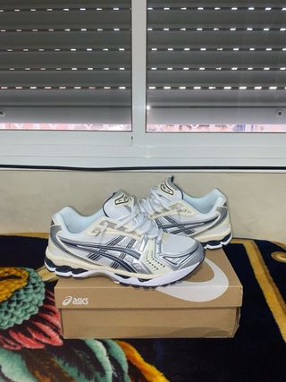 Zapatillas Asics Gel Kayano 14 en tonos plateados y blancos. - Diseño deportivo y moderno. - Detalles en contraste.