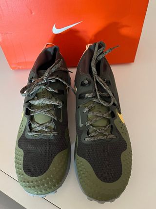 La Nike Wildhorse 6 es una zapatilla de trail running destacada por su amortiguación Nike React para confort y retorno de energía, tracción robusta con goma resistente y tacos agresivos (con revestimiento Anti-Clog para barro), y un upper transpirable con cuello de tipo calcetín que bloquea la entrada de suciedad, ideal para terrenos de montaña no excesivamente técnicos, ofreciendo ajuste seguro y estabilidad mejorada en el talón. sin caja original