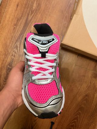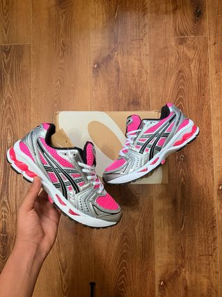 Zapatillas deportivas Asics Gel-Kayano 14 en tonos rosas y plateados. Un diseño llamativo y cómodo. - Parte superior de malla transpirable. - Detalles de diseño icónicos de Asics. - Suela con tecnología GEL para amortiguación. - Caja bastante dañada pero la protego bien para el dia del envio.