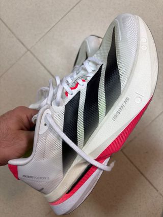 Zapatillas deportivas Adidas Adizero Boston 13. Talla 40 2/3. - Diseño ligero y transpirable. - Suela con amortiguación. - Detalles en color negro y blanco. Se venden porque las compré pensando que serian la misma talla de las Boston 12, quedan un pelín mas justas y me molestan al correr, entonces necesito la siguiente talla. Tienen literalmente 5Km, precio original 160€ y las compré en rebajas en la tienda Forum Sport por 110€. Se aceptan preguntas, consultas, etc.. Y si hubiera dudas puedo adjuntar la factura que aun la conservo. Precio poco negociable debido al uso.