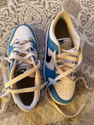 Zapatillas deportivas Nike en azul y amarillo flúor, talla 37. Ideales para hacer deporte o para el día a día. - Están en buen estado. - Tienen los cordones originales negros, bastante desgastado. - Se han usado para correr así que la suela también está bastante desgastada.