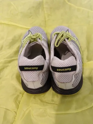 Zapatillas deportivas Saucony para correr. - Diseño con detalles en gris, blanco y amarillo. - Cordones de ajuste. - Suela con buen agarre.