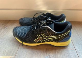 Zapatillas deportivas ASICS, ideales para trail, hockey hierba o pádel. - Diseño en color negro con detalles en amarillo. - Marca ASICS. - Se limpian y están casi como muevas, ver tacos.