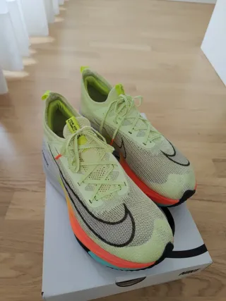 Zapatillas de running Nike Alphafly I en color amarillo neón y detalles en naranja y azul. - Parte superior de tejido técnico. - Mediasuela con tecnología ZoomX. - Diseño aerodinámico.