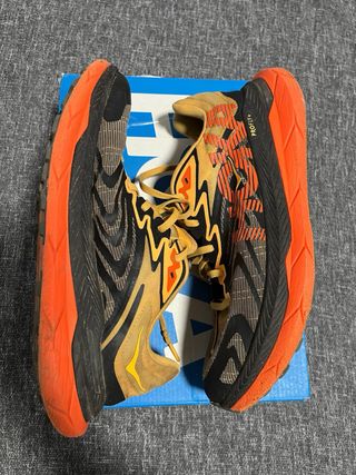 Zapatillas de clavos Hoka Cielo X en talla 43. - Diseño multicolor con detalles en naranja. - Suela con clavos para competición. - Logotipo Hoka visible en la plantilla.