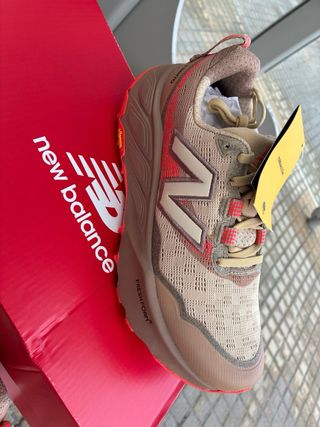 Zapatillas de trail running New Balance Hierro v9 para mujer. - Diseño en tonos beige y detalles en rojo. - Suela con tecnología Fresh Foam X. - Agarre y durabilidad de la suela Vibram.