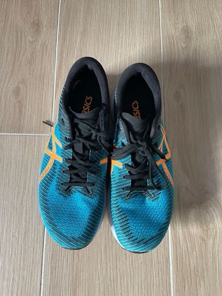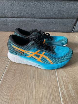 Zapatillas de running ASICS MagicSpeed en llamativos tonos azul y naranja. Diseñadas para ofrecer una experiencia de carrera dinámica. - Llevan Placa de carbono - Parte superior de malla transpirable. - Mediasuela con tecnología FF Blast+. - Detalles de diseño en naranja. - Cierre con cordones negros. Casi nada de uso.