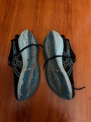 Zapatillas deportivas Asics Novablast 4 en color negro y azul. Están usadas con aproximadamente 500km. Aún están para usar a rodar.