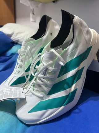 Zapatillas de running Adidas Adizero Adios Pro 4. - Completamente nuevas, con etiqueta y en su caja. - Diseño en blanco y verde azulado. - Fibra de carbono, la gama mas alta de adidas para asfalto. Algo negociable