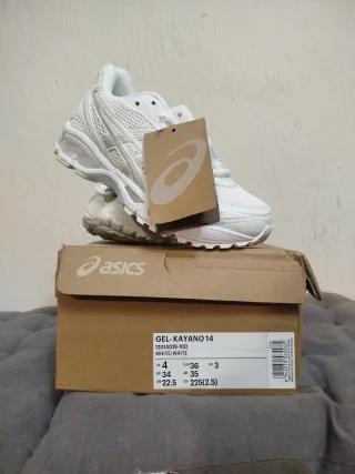 Zapatillas deportivas Asics Gel-Kayano 14 en color blanco. - Modelo: 1201A019-100. - Talla EUR 36 (US 4, BR 34, UK 3, CM 22.5, AR 35, CN 225(2.5)). Tallan pequeño como un 35EU más bien