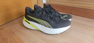 Zapatillas deportivas Puma Magnify 2 en color negro con detalles en amarillo. Diseñadas para ofrecer comodidad y rendimiento. Usadas 4 días. - Parte superior de malla transpirable. - Mediasuela con tecnología NITRO. - Suela de goma para mayor tracción.