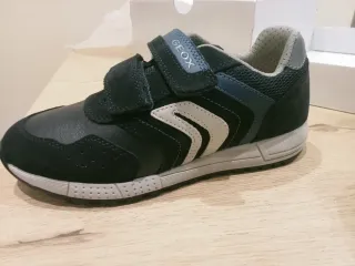 Zapatillas deportivas Geox para niño con cierre de velcro. - Color azul marino y blanco. - Material exterior de piel y ante. - Suela de goma. - Logo de Geox en la lengüeta. - Su precio original, 59'90€. Perdí el ticket y le vienen demasiado justas.
