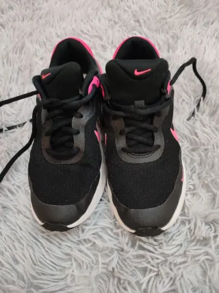 Zapatillas deportivas Nike para niña, talla 36. -Usadas poco, se le han quedado a mi hija pequeñas muy pronto😬, son de esta temporada. - Diseño en color negro con detalles en rosa. - Cierre con cordones para un ajuste seguro. -Las envío sin plantilla,mi hija las quito.
