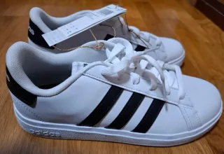 Zapatillas deportivas para niñ@ o adulto de la marca Adidas. Sin estrenar,completamente nuevas como se puede apreciar en las fotografías. Talla 37 y un tercio. - Diseño clásico en blanco con detalles en negro. - Cierre de cordones. - Logo de Adidas en el talón.