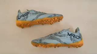 Zapatillas de fútbol para niño en talla 31. - Diseño deportivo en azul y naranja. - Cierre con cordones.