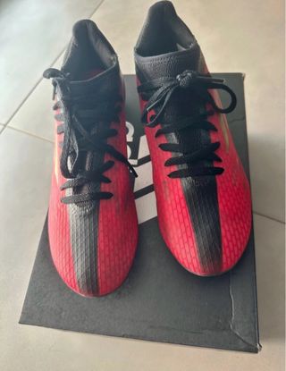 Zapatillas de fútbol Adidas para niño, con un diseño llamativo en rojo y negro. - Cierre con cordones. - Detalle de las tres rayas de Adidas. ADIDAS X SPEEDFLOW.3 FG Rojo/Dorado Metálico/Negro Se han puesto 10 veces, por lesion y cese de jugar toda temporada. Están muy bien. Tacos muy bien. Ver fotos para ver pequeños signos de desgaste por partidos. Talla 40 ( 25 cm)