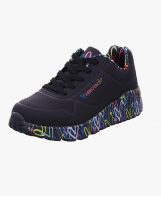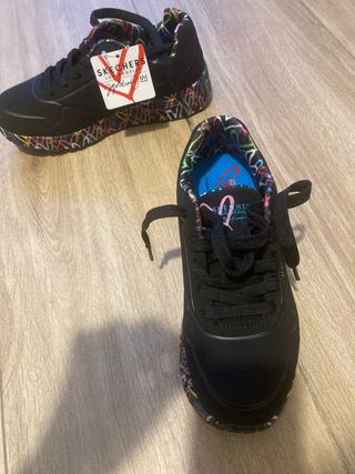 Zapatillas deportivas para niña de la marca Skechers. Presentan un diseño llamativo y moderno. - Exterior negro con detalles multicolor. - Suela con estampado gráfico vibrante. - Interior con estampado de corazones. - Cierre de cordones.