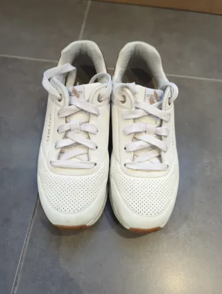Zapatillas deportivas Skechers para niñ@ en color blanco con detalles dorados/cobre. - Cierre de cordones. - Suela de goma. - Diseño moderno y cómodo. Solo venta durante curso escolar.
