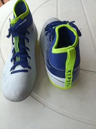 Zapatillas de fútbol marca Kipsta en color azul y blanco. Ideales para la práctica deportiva. - Diseño deportivo. - Cierre con cordones. - Detalle de color neón en el talón y cuello.