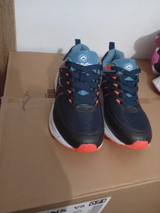 Zapatillas deportivas para niños con un diseño moderno y llamativo. - Combinación de colores azul y naranja. - Cierre con cordones para un ajuste seguro. - Suela blanca con detalles.