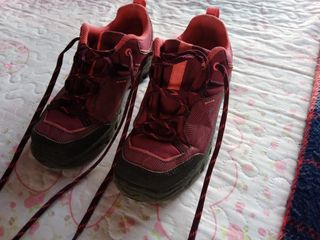 Zapatillas de montaña, son un 34 grande, casi equivalen a un 35, muy poco usadas, buena suela, naranjas y moradas, compradas en decathlon el año pasado