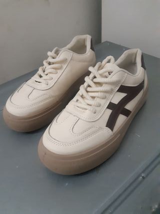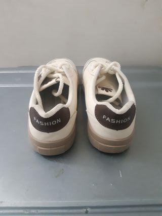 Zapatillas de moda para niña. - Diseño deportivo y casual. - Combinación de colores beige y marrón. - Cordones para un ajuste seguro.