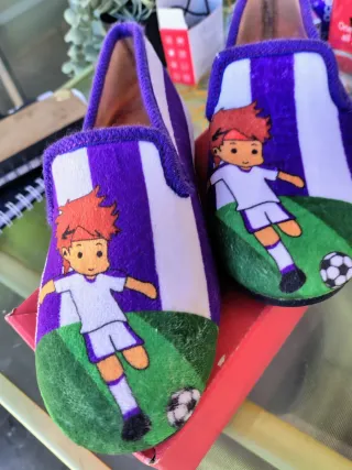 NUEVAS. TALLAS DE 27 a 31. Por cierre tienda familiar. Zapatillas infantiles con un divertido diseño de fútbol. - Estampado de rayas moradas y blancas. - Ilustración de un niño jugando al fútbol
