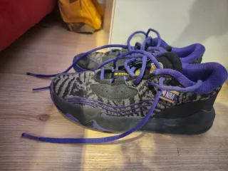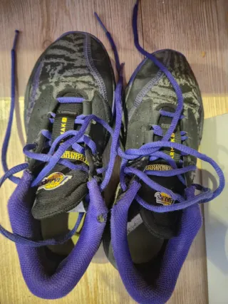 Zapatillas de baloncesto Lakers Tamark para niño, con un diseño llamativo en negro y morado. Cómodas, buen estado, pequeña rozadura pie izquierdo, adjunto foto, por eso el precio - Cierre con cordones. - Detalle de logo en la lengüeta. - Suela de goma.