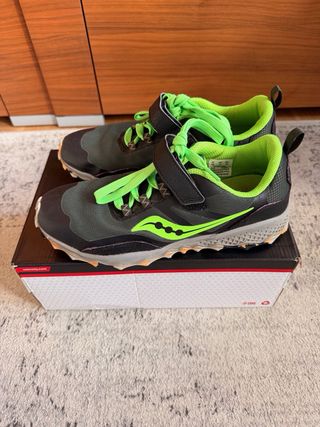 Zapatillas de trail running Saucony Peregrine 12 Shield A/C para niños. - Color gris y verde. - Cierre de velcro y cordones. - Diseño resistente para exteriores.